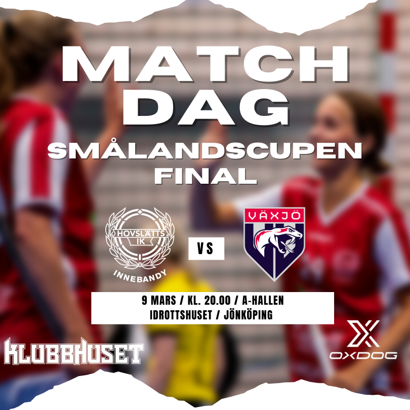FINALDAGS i Smålandscupen och vårt eminenta damlag gästas under torsdagskvällen av Växjö IBK med matchstart kl. 20.00 i A-Hallen i Idrottshuset i Jönköping. I kväll är det dags att släppa alla planer och gå man ur huset för att ta er till Idrottshuset i Jönköping och stötta Hovslätt Dam till cupvinst i Smålandscupens Final. Vårt fantastiska damlag har gått som tåget i Smålandscupen och nu är det äntligen dags för Le Grand Finale då man ställs mot Växjö IBK. Varmt välkomna att heja fram Hovslätt Dam till en cupseger! Matchen startar kl. 20.00 i A-Hallen. Kan du mot all förmodan inte vara på plats och se matchen live, går det att se matchen via Innebandy TV på nedan länk! INNEBANDY TV