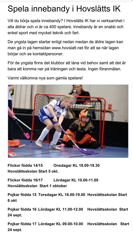 Vill du börja spela innebandy? I Hovslätts IK har vi verksamhet i alla åldrar och vi är ca 400 spelare. Innebandy är en snabb och enkel sport med mycket teknik och fart. De yngsta lagen startar enligt nedan medan de äldre lagen kan man gå in på hemsidan www.hovslatt.net för att se när lagen börjar och se kontaktpersoner. För de yngsta finns det klubbor att låna vid behov samt att det är bara att komma ner på träningen och testa. Ingen föranmälan. Varmt välkomna nya som gamla spelare! Flickor födda 14/15 Onsdagar KL 18.00-19.30 Hovslättsskolan Start 5 okt. Flickor födda 16/17 Lördagar KL 10.00-11.00 Hovslättsskolan Start 1 oktober Pojkar födda 15 Torsdagar KL 17.45-19.00 Hovslättsskolan Start 6 okt Pojkar födda 16 Lördagar KL 11.00-12.00 Hovslättsskolan Start 24 sept. Pojkar födda 17 Lördagar KL 09.00-10.00 Hovslättsskolan Start 24 sept. För mer info se www.hovslatt.net lagsidor.