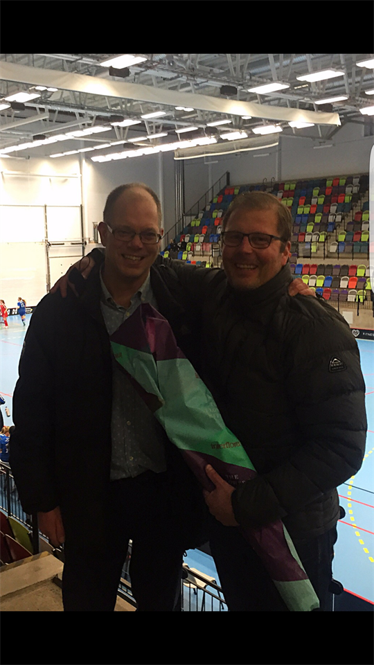 Peter Bäck blev årets sista vinnare av Hemmavinsten. Han vann hela 79 000 kr. Vi säger ett stort grattis från föreningen som också vann 1500 kr i och med detta. Här ses ordförande Stephan Knuthas (till vänster) gratulera honom i Idrottshuset. Detta efter att ha överraskat honom ordentligt efter ett fejkat möte. Se www.hemmavinsten.se för film och fler vinnare. Är du inte redan med så ta chansen att bli en vinnare du med och samtidigt stötta Hovslätts IK Innebandy.