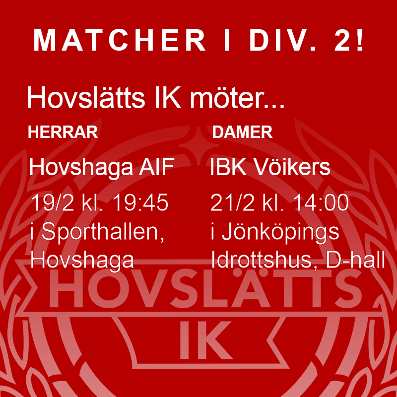 Inte så många matcher denna helg, detta p.g.a. sportlov. Bara två ungdomsmatcher (P03 & F02/03), båda i Stadsgården på söndag. Däremot är alla våra seniorserier igång och spelar. Det börjar på fredagskväll med ytterligare en viktig match för vårt A-lag herrar, nu borta mot Hovshaga AIF. Även B-lag herr spelar borta (mot Gränna) på fredag. Sedan på söndag spelar A-lag damer mot serieledarna IBK Vöikers och detta är hemma i D-hallen. Samtidigt spelar B-lag dam borta (mot Vöikers B). Det avslutas sedan på söndagskväll med JAS-match hemma mot Fagerhult Habo IB