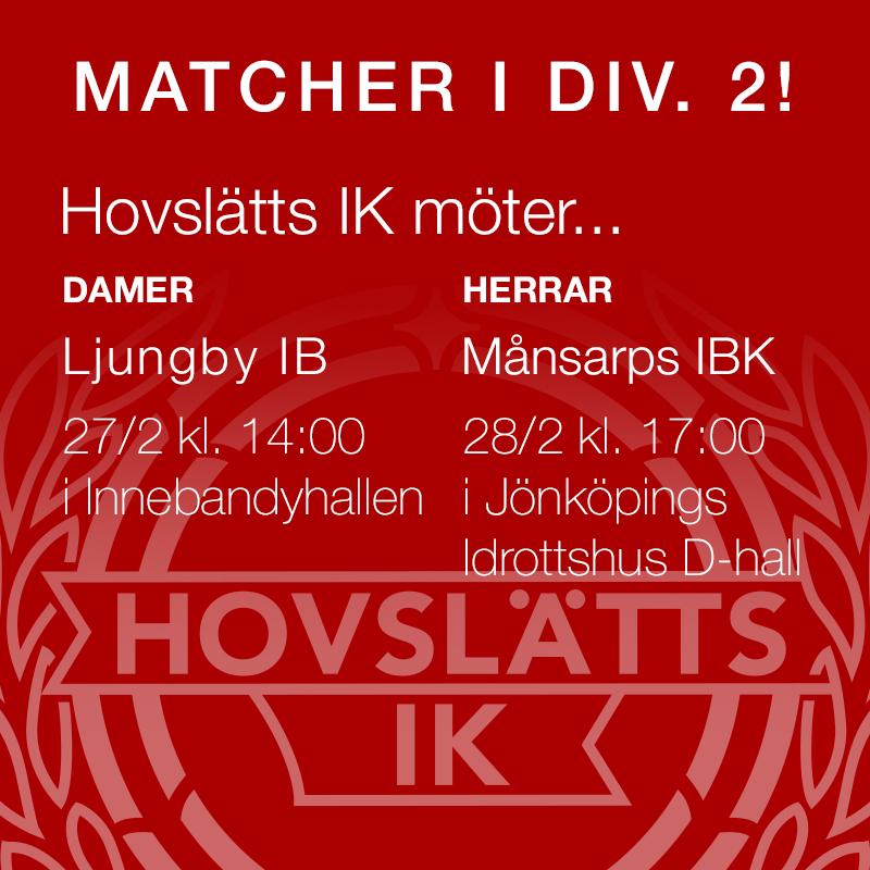 Nu börjar det närma sig slutet i div. 2 serierna och både Damerna och Herrarna är med i toppstriden. Damerna som har 2 matcher kvar kämpar om att komma 2:a och då få kvala upp till Allsvenskan. Herrarna har 3 matcher kvar och de kämpar om att ta en av de två plaster som ger en plats i div. 1 nästa säsong. Det har sett tufft ut för damerna att komma 2:a i tabellen, men fortfarande finns chansen. Mren då krävs 2 segrar samtidigt som övriga resultat måste gå vår väg. Nu senast vann de mot suveräna serieledarna IBK Vöikers, mycket starkt gjort. Vi stänkte upp segermålet med fem minuter kvar, oerhört viktigt. Nu möter vi Ljungby IBK borta på lördag och seger krävs givetvis. Sedan får vi se vad som händer i resultatväg för övriga lag som är inblandade i toppstriden. Tabell (toppen) IBK Vöikers 48 (+102) Sävsjö IBK 41 (+28) Craftstadens IBK 36 (+36) Hovslätts IK 36 (+24) Herrarna har varit med i toppen hela serien och de senaste omgångarna har de pendlat mellan de två översta placeringarna och tredje till sjätte plats. Men nu inför de sista 3 omgångarna ligger de på rätt sida strecket. Nu får vi se till att stanna där och det ser ju förhoppningsfullt ut kommande omgång, vi möter Månsarp som ligger näst sist. Vinner vi inte där har vi inte i toppstriden att göra. Senast, som sagt tog vi en mycket viktig seger borta mot Hovshaga, mycket starkt gjort. Som ni ser i tabellen är det extremt jämnt i toppen och tittar man på de kommande 3 omgångarna ser det ännu mer spännande och ovisst ut. Det kan i princip gå hursomhelst för topplagen möter varandra inbördes i flertalet av matcherna och att tippa detta är hopplöst svårt. Men vi kan bara fokusera på våra matcher, först hemma mot Månsarp, sedan hemma mot Vetlanda och i sista omgången (en rysare!!) borta mot Vimmerby. Tabelen (toppen) Carlshamn 42 (+43) Hovslätts IK 41 (+71) Slätafly 40 (+48) Vetlanda 40 (+46) Vimmerby 39 (+38) Hovshaga 38 (+28) Nässjö 37 (+63) Kom nu till D-hallen på söndag och heja fram våra herrar i derbyt mot Månsarp, till seger!!!